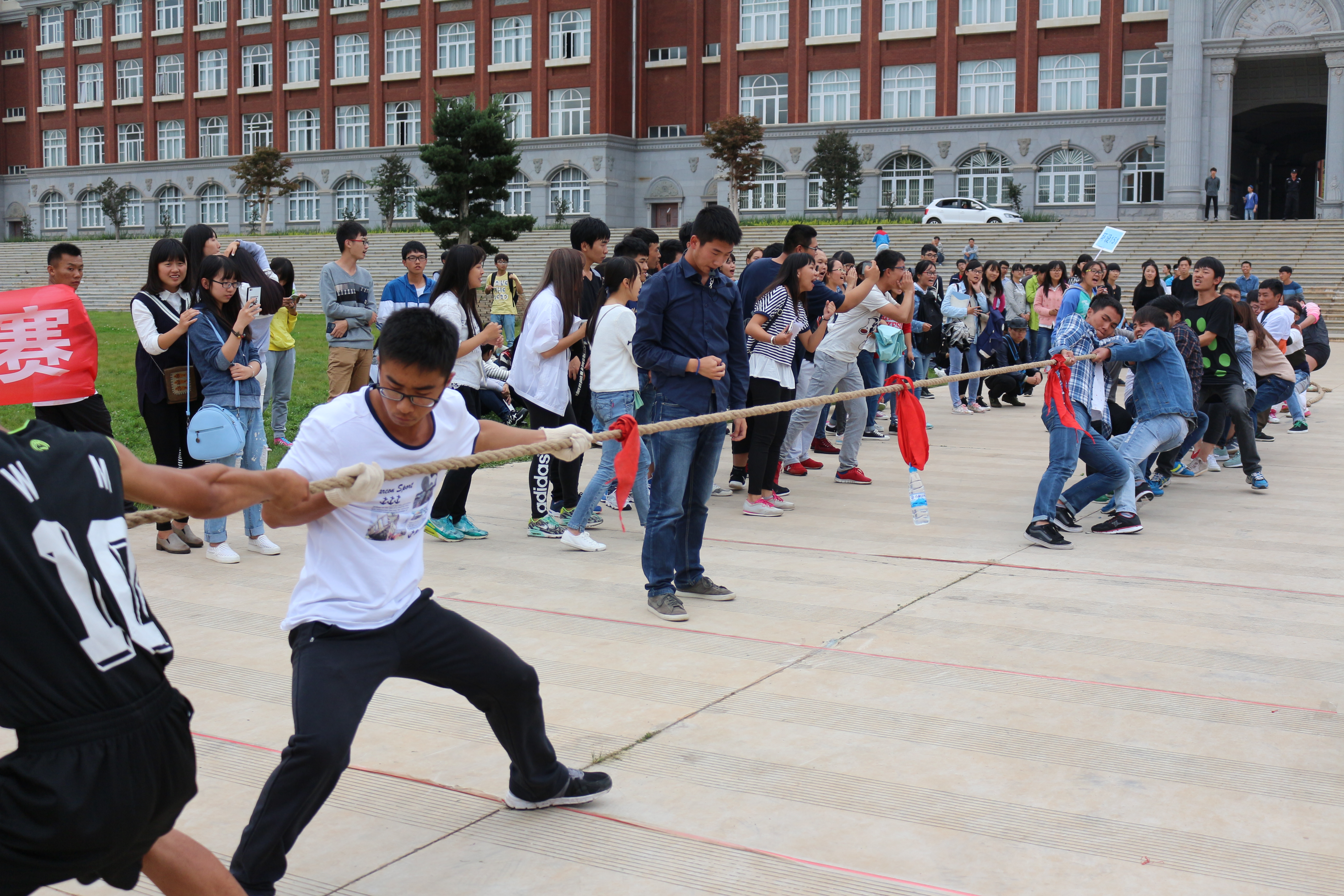 学生会体育部承办的“艺传视界·2015年迎新杯拔河比赛”在公教楼前大马路上举行。此次比赛的参赛对象是2015级新生,以班级小组为单位进行的。