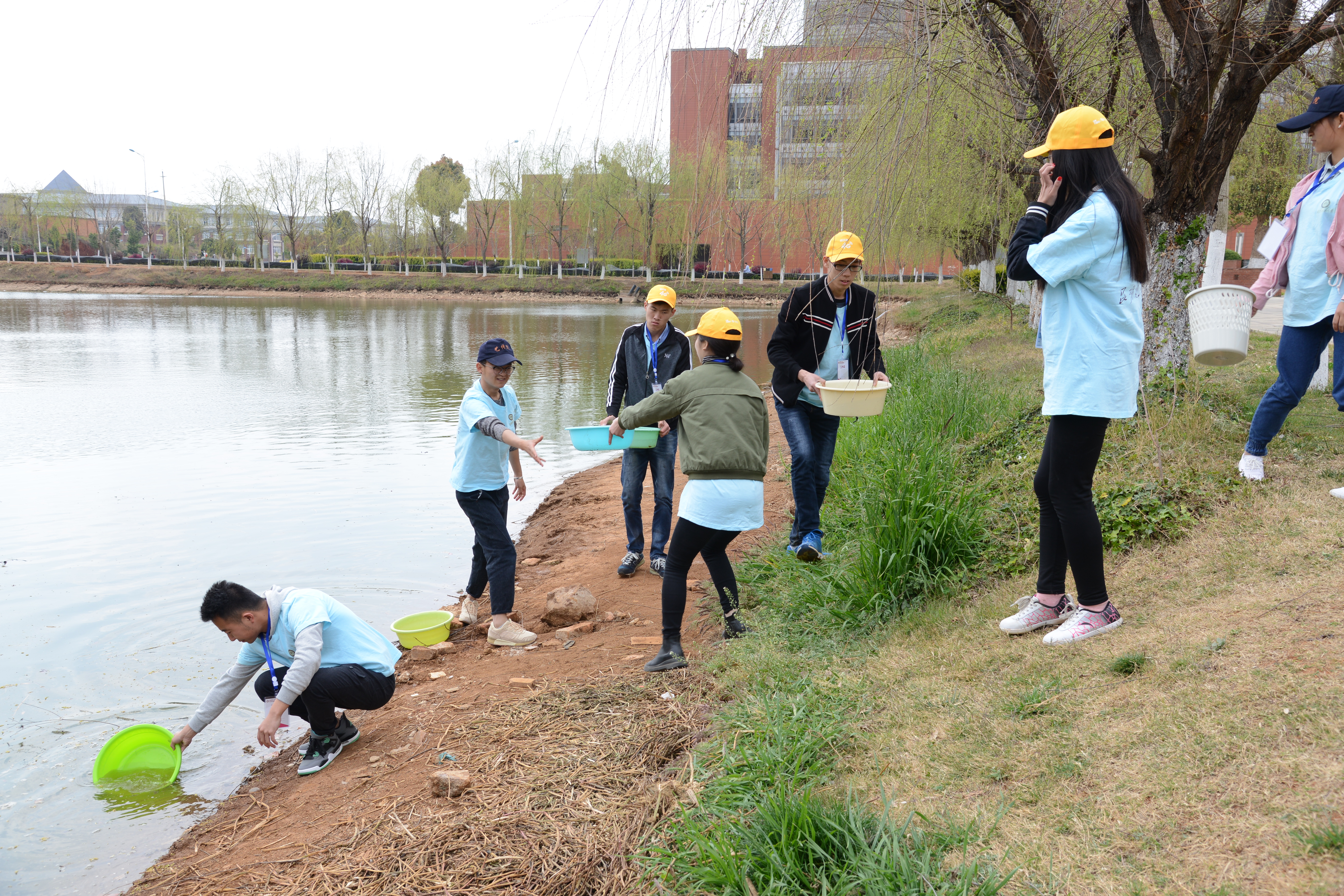 30多名青年志愿者在院学生会主席的带领下来到了义务浇水点。志愿者们就近取材,挽起袖子就是干,拿起自己的水盆,从红土会堂旁的水池里打来水,积极有序地开始了浇水活动。