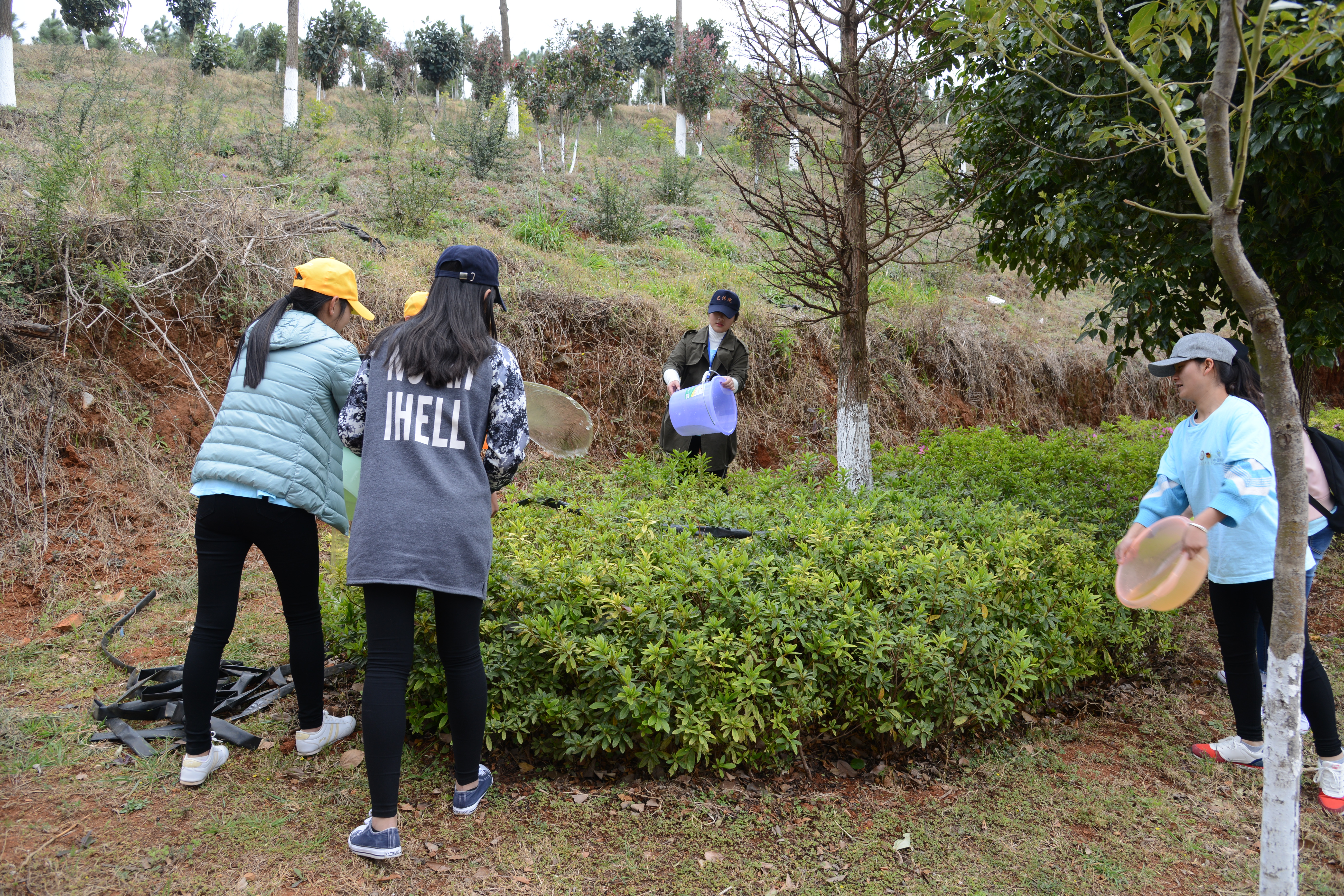 青协组织了30多名志愿者来到红土会堂旁的后山上进行义务浇水活动。