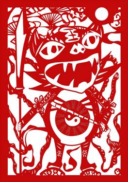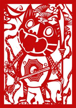 作品描述:使用云南特有的瓦猫进行设计,瓦猫和门神的结合,并用剪纸表现。