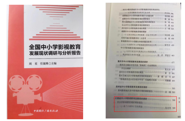 《全国中小学影视教育发展现状调研与分析报告》由中国国际广播出版社出版社出版,是我国第一部聚焦中小学影视教育现状的学术调研成果。朱丹华老师参编的篇目是《中小学影视教育现状调查报告——基于云南和江苏的调查》,文章通过大量调研,系统分析了云南和江苏两地的中小学影视教育现状,是云南和江苏中小学影视教育研究的基础性文献。