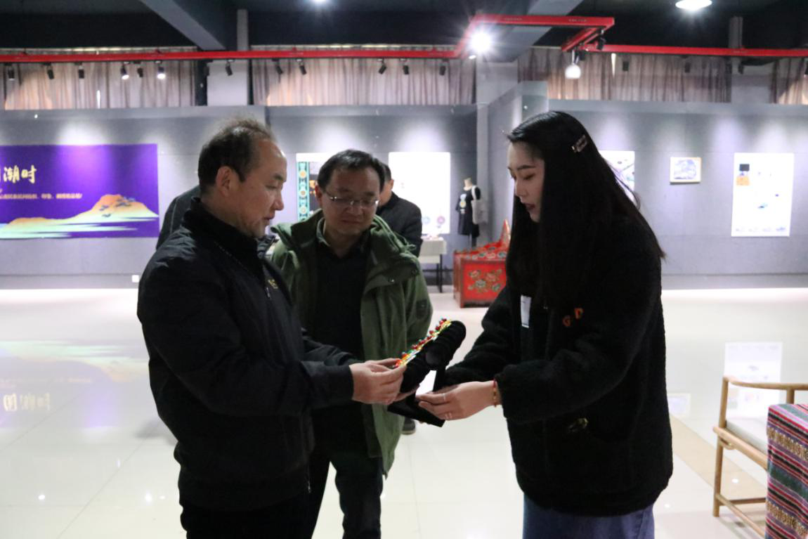 党委书记孙刚、院长许佳、副院长张建国和副院长王勇的陪同下先后参观了纵横经纬的艺术·云南民族民间织、染、剪、绣精品展和云岭正当国潮时·云南民族文化创意产品设计展。