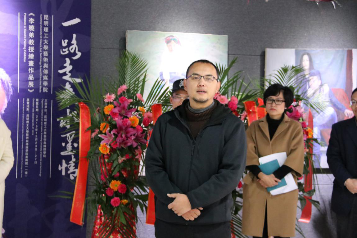 李晓弟教授对学校、学院领导的到来表示感谢,并谈到举办此次画展的初衷以及作品的创作过程;他希望大家在观看作品时,从平常心、本心和真心去观赏,相信自己的直觉。