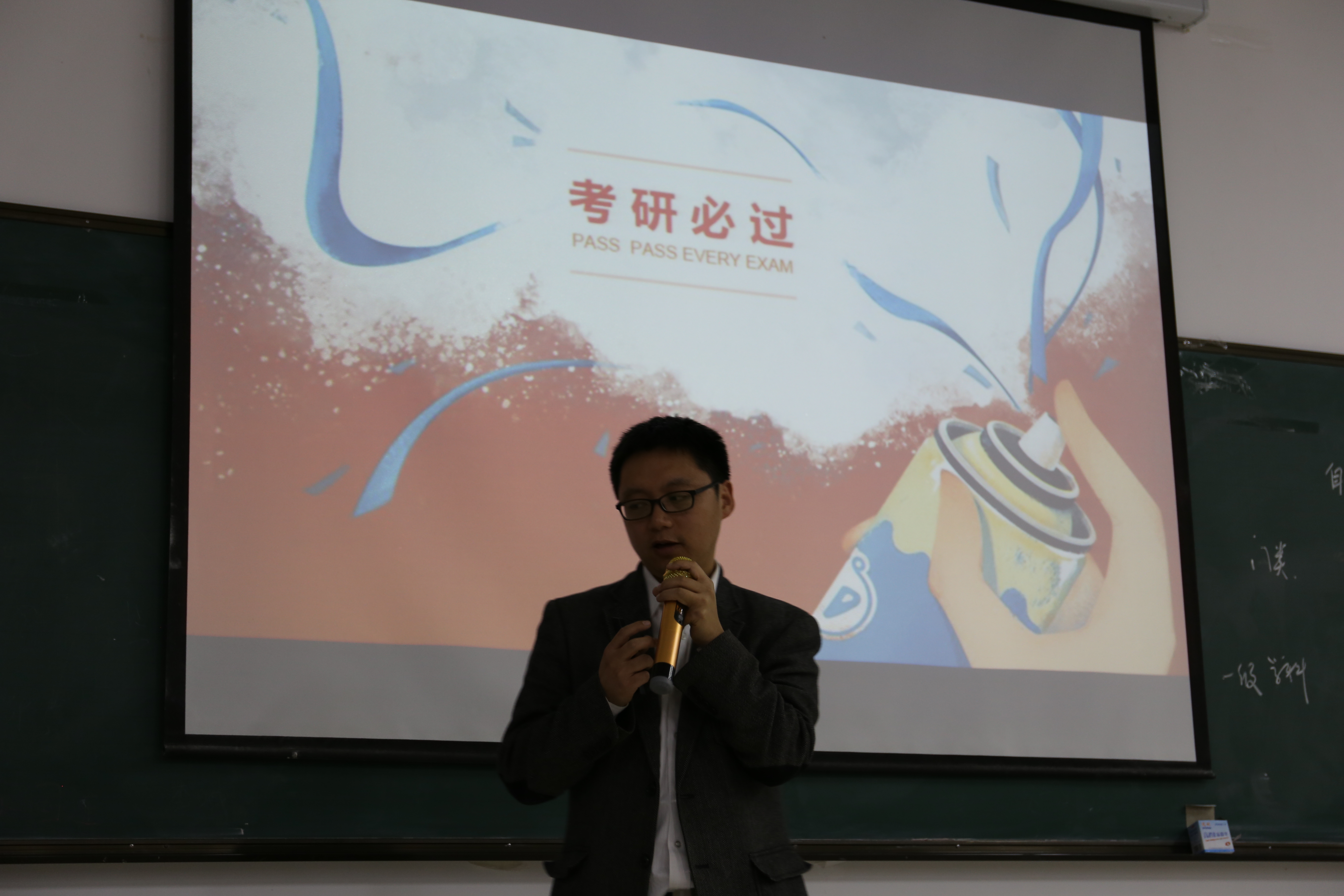 动员会上,崔颖老师结合自己的求学经历,围绕着“考研是什么、为什么考研、怎么复习”三个方面开展讲座。崔老师对“考研报名流程、考研科目详情、报考院校选择”等情况做了详细介绍和说明,他指出:“大多数研究生的英语能力更突出、学科知识体系更完善、毕业后有更好的择业选择和更明晰的职业规划。”这给处于迷茫状态的2017级学生指明了方向,也为准备考研的同学打了一针强心剂。崔老师还强调:考研复习是一场“个人攻坚战”,大家首先要正确的评估自己,定一个力所能及的目标并搜集学科、专业的相关信息,不要盲目从众,适合的才是最好的;其次,要制定科学合理的学习计划,并坚持不懈地努力,实事求是的投入到学习中,心无旁骛;再次,大家要与各位教师积极沟通,教师会根据学生实际情况给出科学合理的建议,耐心的为同学们答疑解惑,并为学生提供一些复习的方法和思路,最后,崔老师还把自己的联系方式留给大家,欢迎大家及时交流、沟通。