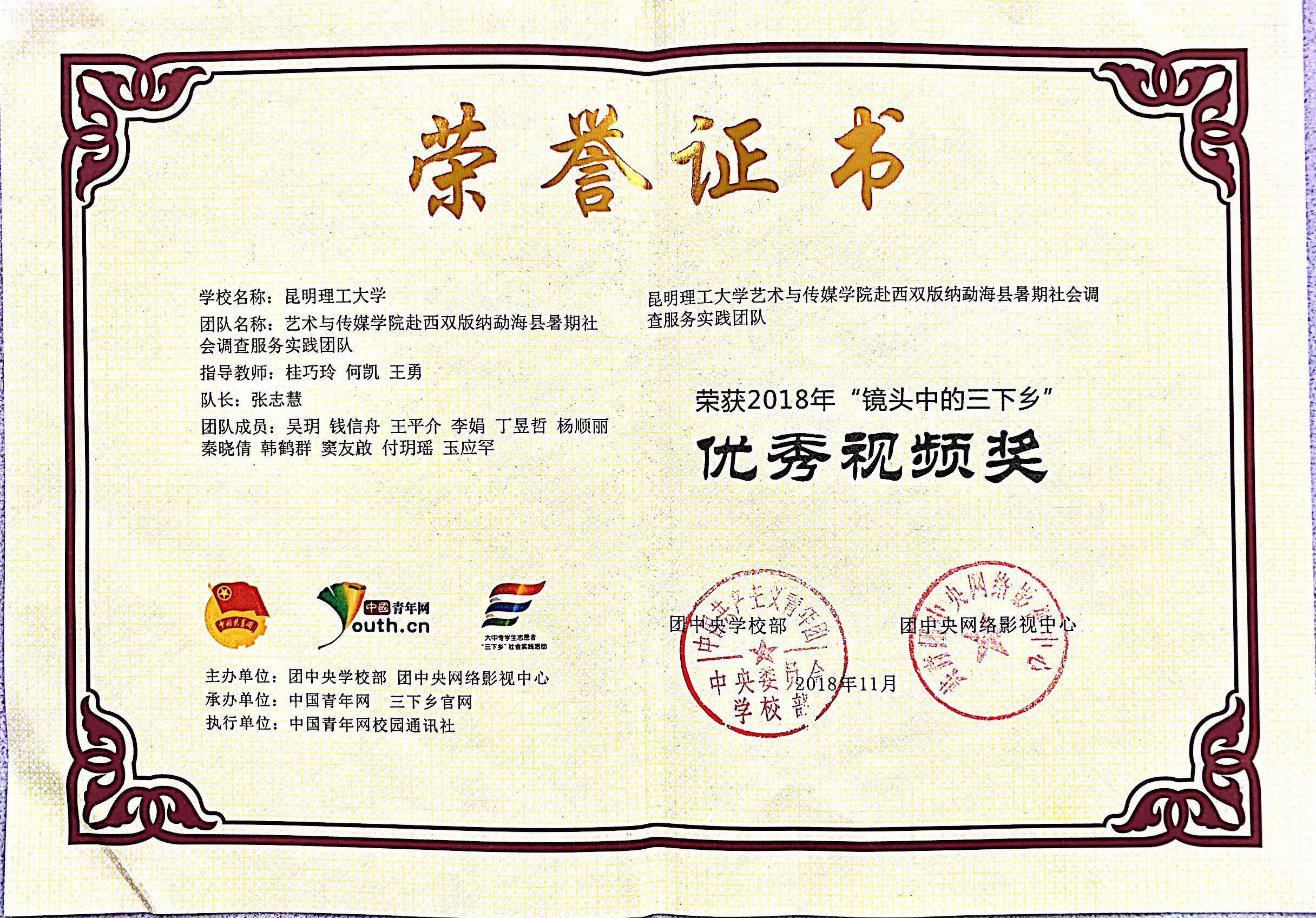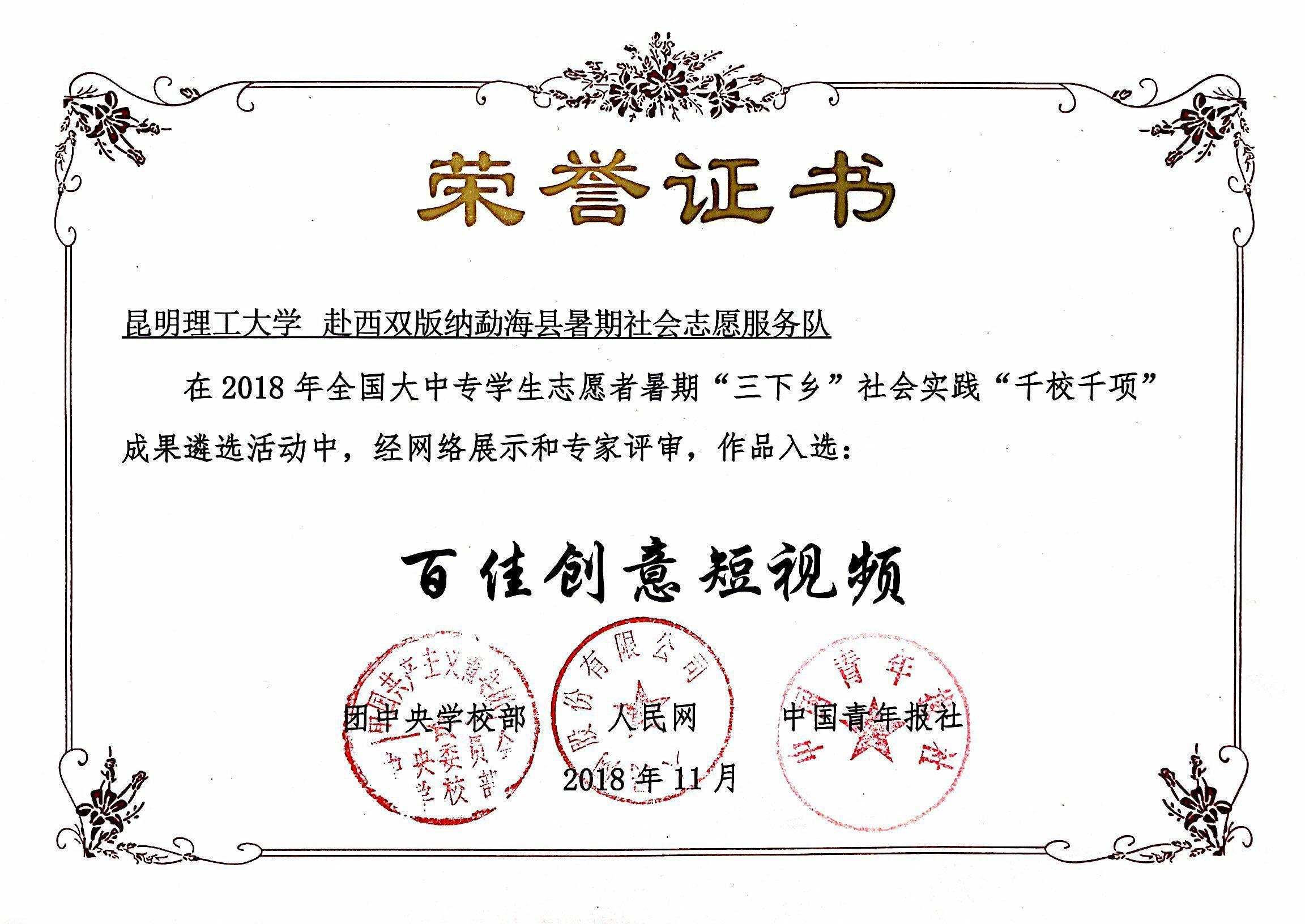 的“三下乡”成果获得“镜头中三下乡”优秀视频奖和“千校千项”百家创意短视频奖,服务队成员张志慧同学获“强国一代新青年”荣誉称号。