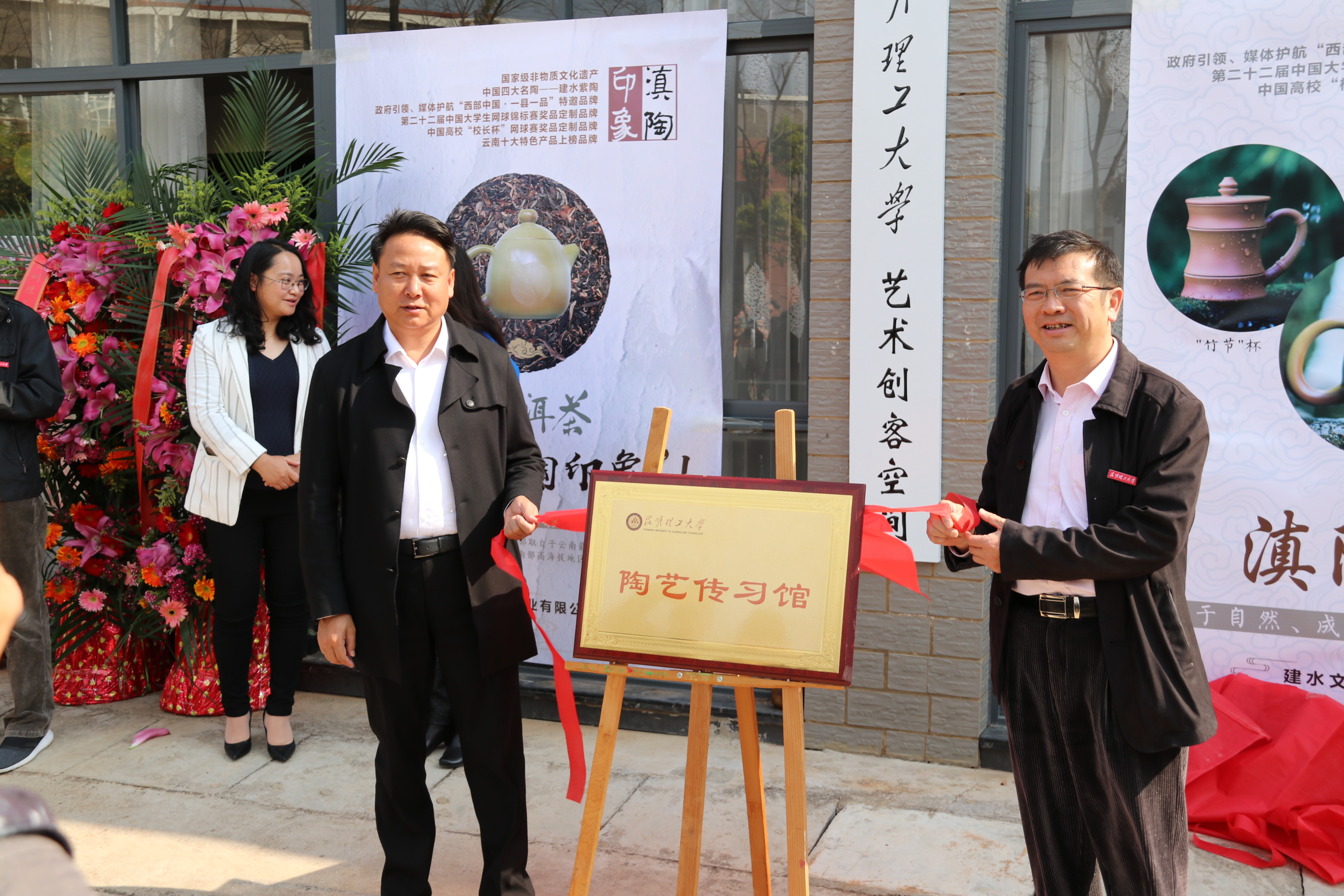 院长许佳在讲话中感谢学校领导和校友、建水县领导对艺术创客空间成立的支持。她说,学院将利用艺术创客空间开展艺术工坊式教学,打造特色艺术类课程,提升我校人才培养的质量。随后,张英杰书记与文冶陶业有限公司董事长李俊荣共同为艺术创客空间揭牌,牛治亮副校长与中共建水县委常委、宣传部长杨为文共同为陶艺传习馆揭牌。