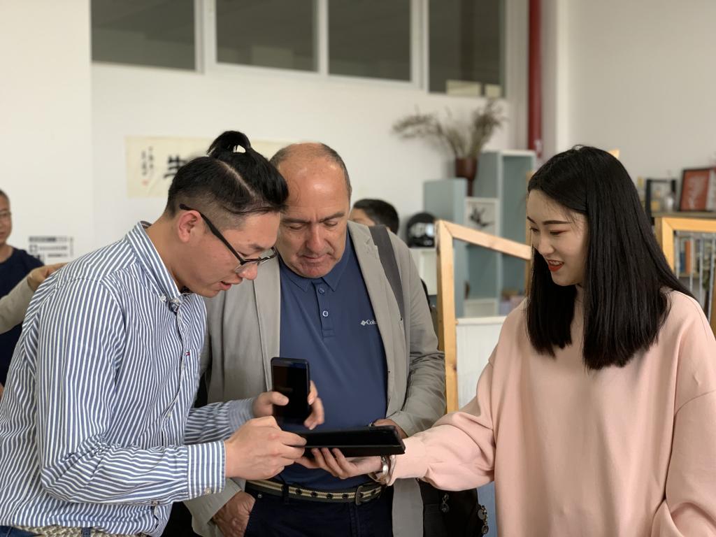 图4 西南民族文化遗产与创意产业研究中心研究生向Francesso Savonitto先生展示设计作品