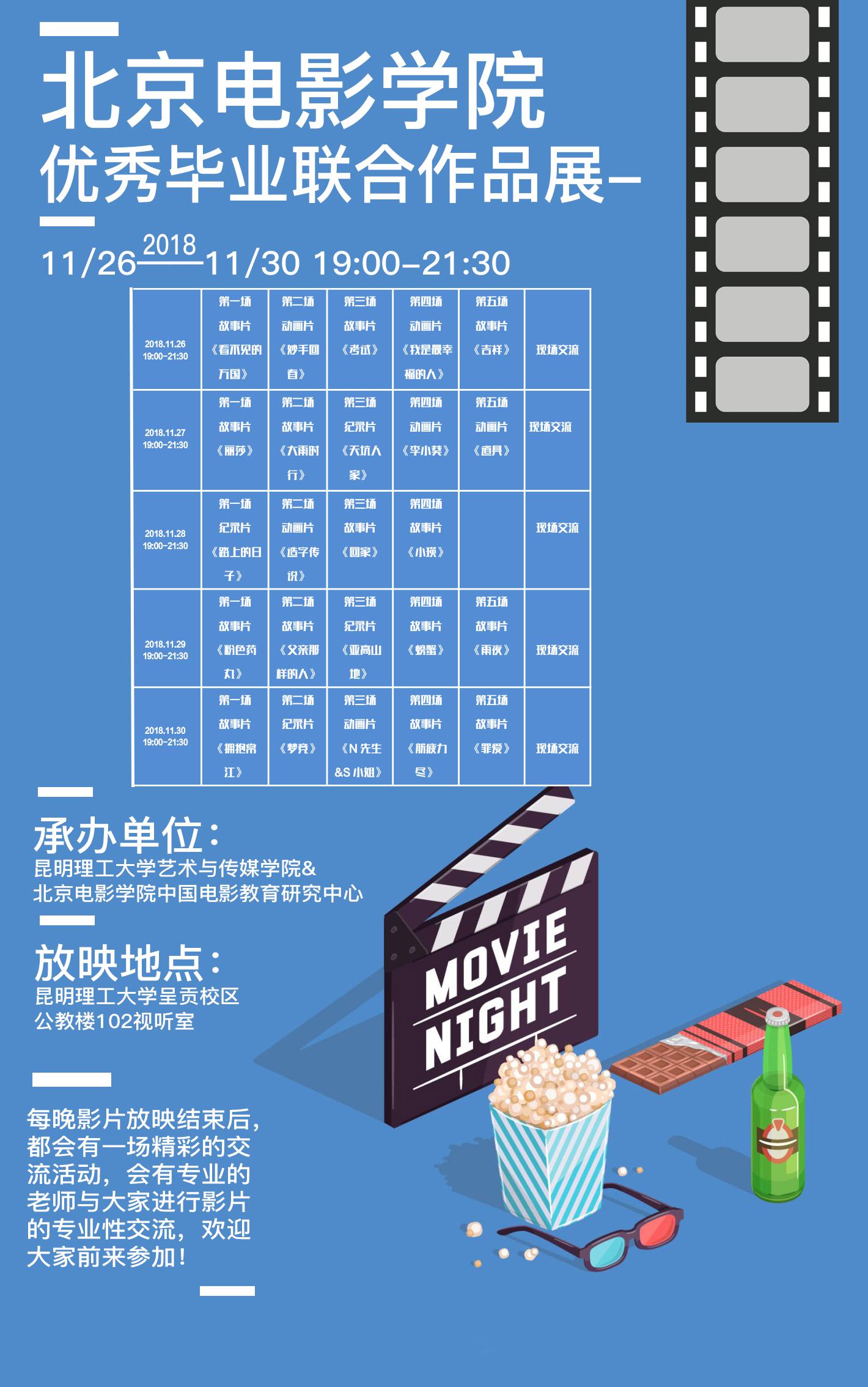 公教楼102举行的“北京电影学院毕业联合作业展”共放映了24部优秀的2018届北京电影学院毕业联合作业。分别有故事片,纪录片,动画片三种类型。“北京电影学院毕业联合作业”是一项针对应届毕业生的教学任务,各系各专业都选派优秀的应届毕业生,在第一指导教师负责制的指导下参与完成作业,学生们最终以影片的形式从不同层面上表达了自己对社会、人生和生活的感受。每晚展映结束后,吃瓜网站