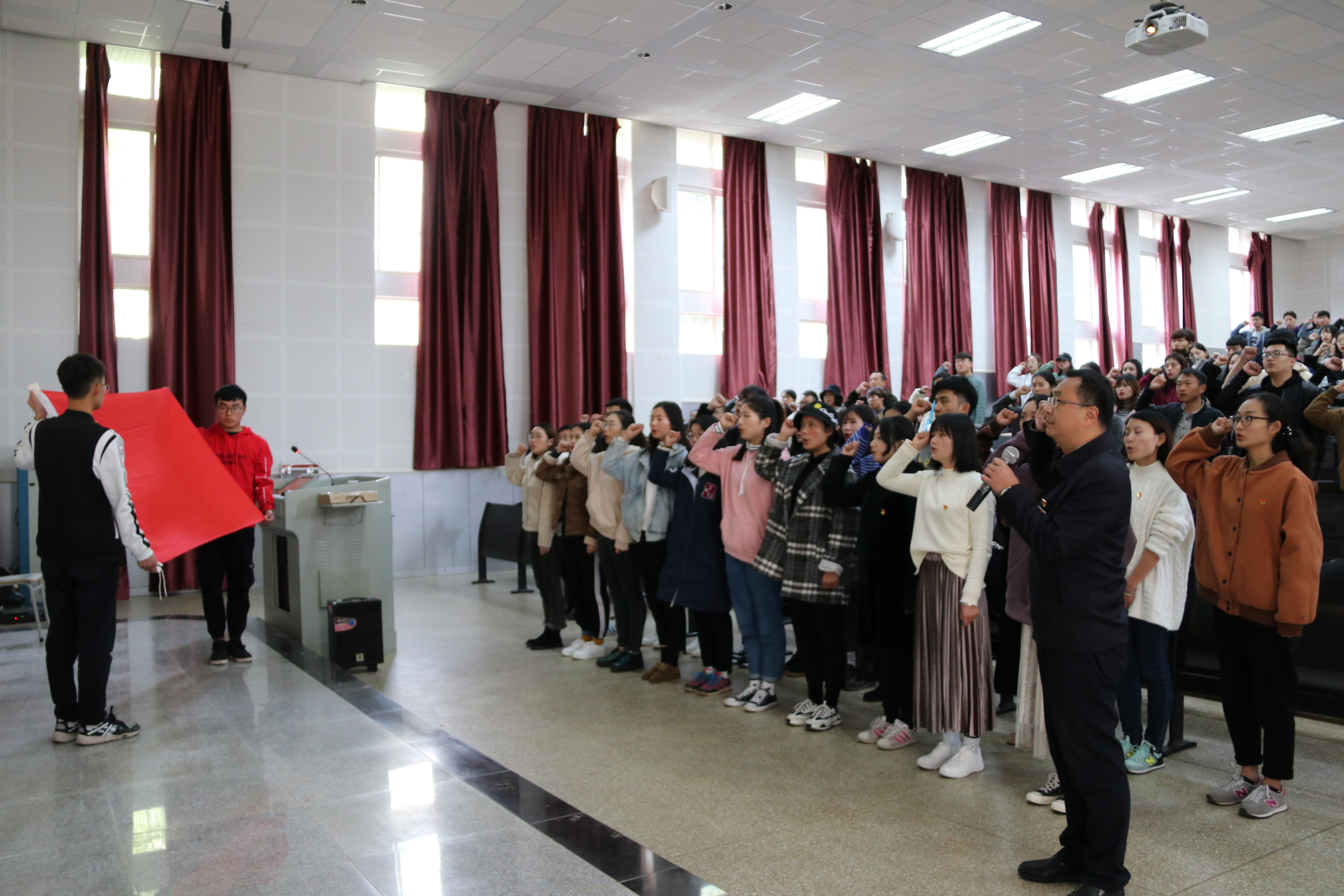 刚刚接收的22名预备党员面向党旗庄严宣誓:“我志愿加入中国共产党,拥护党的纲领,遵守党的章程,履行党员义务,执行党的决定,严守党的纪律,保守党的秘密,对党忠诚,积极工作,为共产主义奋斗终身,随时准备为党和人民牺牲一切,永不叛党。”宣誓仪式上,孙刚书记领誓,全院其他党员同志也齐声朗读,重温入党誓词。