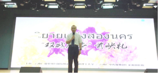 首映礼上,周峰越副校长代表学校祝贺中泰文化交流“双城故事”首映礼圆满成功,并就中国和泰国的文化合作问题与在座的留学生进行了交流。