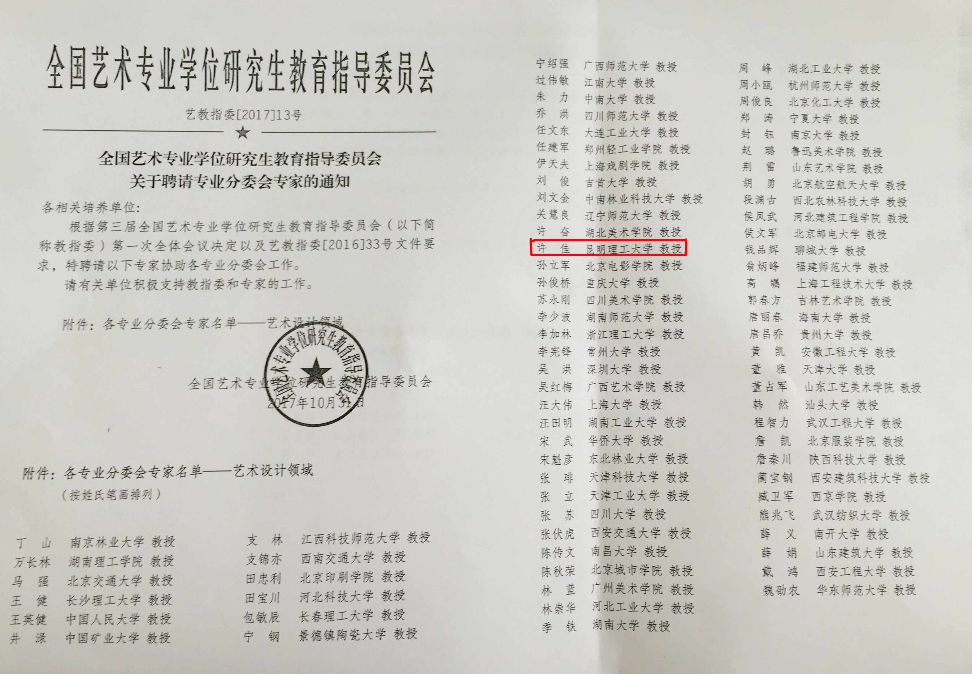 院长许佳教授、副院长王勇教授分别入选为全国艺术专业学位研究生教育指导委员会(艺术设计领域)、(戏剧、戏曲、电影、广播电视领域)专业分委会专家。分委员会专家是由艺术硕士教指委聘任,协助教指委进行艺术硕士专项评估、教育评价体系与认证体系建设、艺术硕士成果展示平台建设及成果审查等工作。
