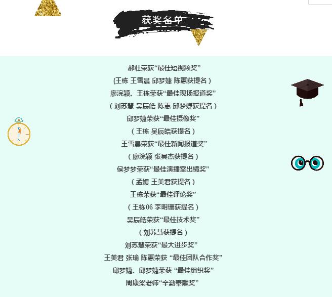 本次活动共设“最佳短视频奖”、“最佳现场报道奖”、“最佳摄像奖”、“最佳新闻报道奖”、“最佳演播室出镜奖”等12个奖项,其中“最佳采访奖”和“最佳模拟演播室节目奖”空缺。老师希望同学们看到自己的进步,也发现不足,今后能做得更好。播音151班同学们也为周康梁老师颁发了“辛勤奉献奖”,以此表达对周老师这段时间以来认真指导和无私付出的感谢。