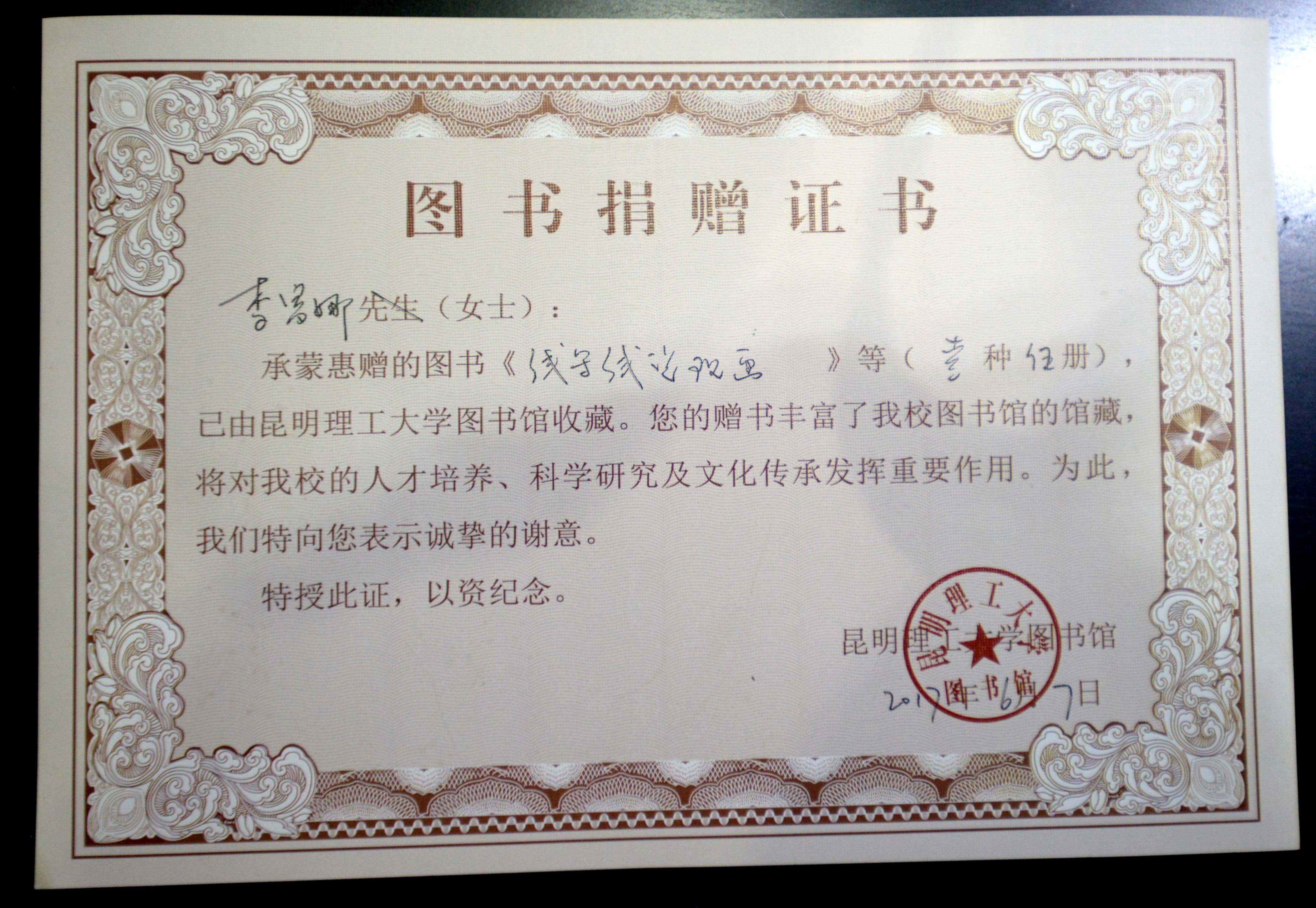 近日,吃瓜网站 美术系李富娜副教授收到了吃瓜网站 图书馆的捐赠证书。李富娜副教授著作的书画作品集《线写线说现画》一书,于2017年4月由云南大学出版社正式出版。