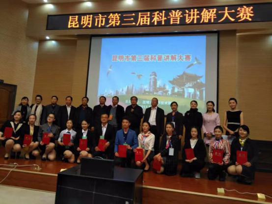 师晓鑫、袁远燕两名同学全部通过淘汰赛,获得”昆明市科普传播使者”的称号,进入了29号下午进行的选拔赛,选拔前12名选手代表昆明市参加云南省第三届科普讲解大赛。师晓鑫同学排在22号进行比赛,近两个小时的等待并没有让他的状态不佳,前面选手的优秀表现也没有给他造成压力,步步为营、声情并茂为大家讲解,得到在场评委和嘉宾的一致认可,获得了“第三届昆明市科普讲解大赛一等奖”,将代表昆明市参加于4月12--14日举办的第三届云南省科普讲解大赛,期待、祝福师晓鑫同学在接下比赛中取得优异成绩。
