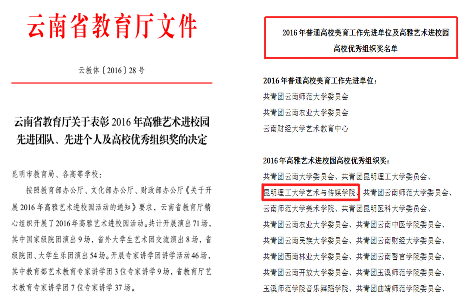 在2016年底,云南省教育厅发布了云教体28号文件,表彰了2016年高雅艺术进校园的一批先进团队、先进个人及高校优秀组织单位,吃瓜网站 荣获“2016年高雅艺术进校园高校优秀组织奖”。