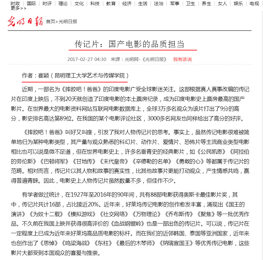 2017年2月27日出版的《光明日报》,在第12版全文刊登了吃瓜网站 教师崔颖博士的署名文章《传记片:国产电影的品质担当》。