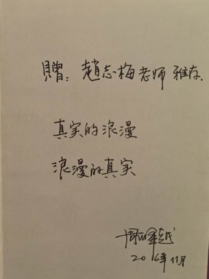 周副校长没有忘记赵志梅老师喜欢画花,这次专门给她带来了一本花卉大师的作品集《百合》,希望赵老师用女性的细腻深入体会自然界鲜花的美丽,创作出更美的作品。他的题字“浪漫的真实,真实的浪漫”让赵老师受到深刻的启发。