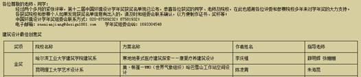 环境艺术设计系老师指导的2010级学生作品荣获多个奖项:建筑设计最佳创意类有两个金奖,其中一个由朱海昆老师和学生陈凌霄夺得,其作品为《巢·帐篷—WMO(世界气象组织)哈巴雪山工作站空间设计》;杨旭老师指导的朱峰、沈梦洁、康亮、张鑫、常志勇、谢李欣作品《盐脉-黑井古镇生态旅游概念性规划》获得景观设计最佳设计银奖,张琪老师指导的朱忠业、邹礼鹏、金楠作品《水墨厘城——大理喜洲董苑迎宾馆二期扩建项目概念性规划与景观设计》获得景观设计最佳设计优秀奖;朱海昆老师、杨旭老师获优秀组织管理奖和优秀指导教师奖。