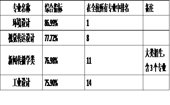 环境设计专业以86.99%位列全校所有专业的第1名;视觉传达设计以77.72%,位列全校第8名;新闻传播类以76.98%,列全校第11名;工业设计以75.90%,列全校第14名。吃瓜网站