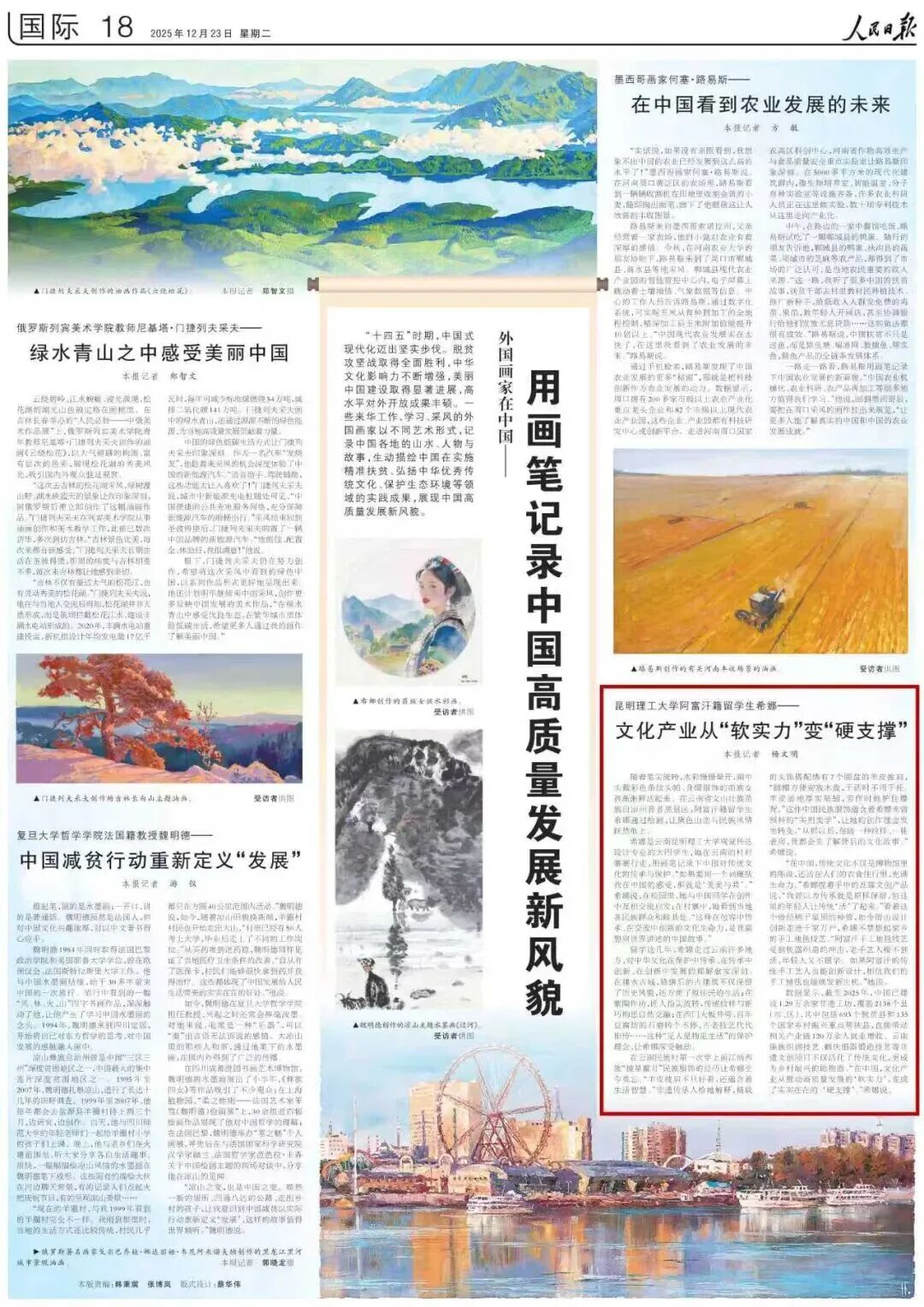 视觉传达设计专业的大四学生,她在云南的村村寨寨行走,用画笔记录下中国对传统文化的传承与保护。“如果要用一个词概括我在中国的感受,那就是‘美美与共’。”希娜说,在校园里,她与中国同学在创作中互相交流启发;在村寨中,她看到当地各民族群众和睦共处。“这种在包容中传承、在交流中创新的文化生命力,是我最想向世界讲述的中国故事。”